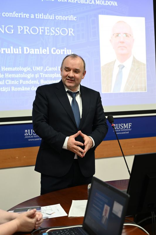 Ceremonia de conferire a titlului onorific Visiting Professor profesorului Daniel Coriu a avut loc la 31 octombrie 2025, în prezența reprezentanților administrației USMF „Nicolae Testemițanu”, cadrelor didactice, studenților și medicilor rezidenți de la Disciplina de hematologie.